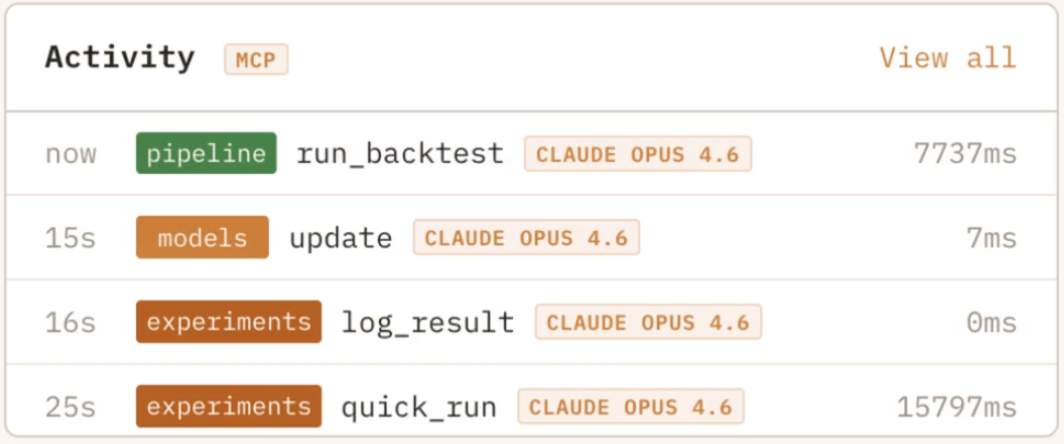 Every MCP tool call streamed live with full parameters and results. You see exactly what your agent is doing and why — no black box.