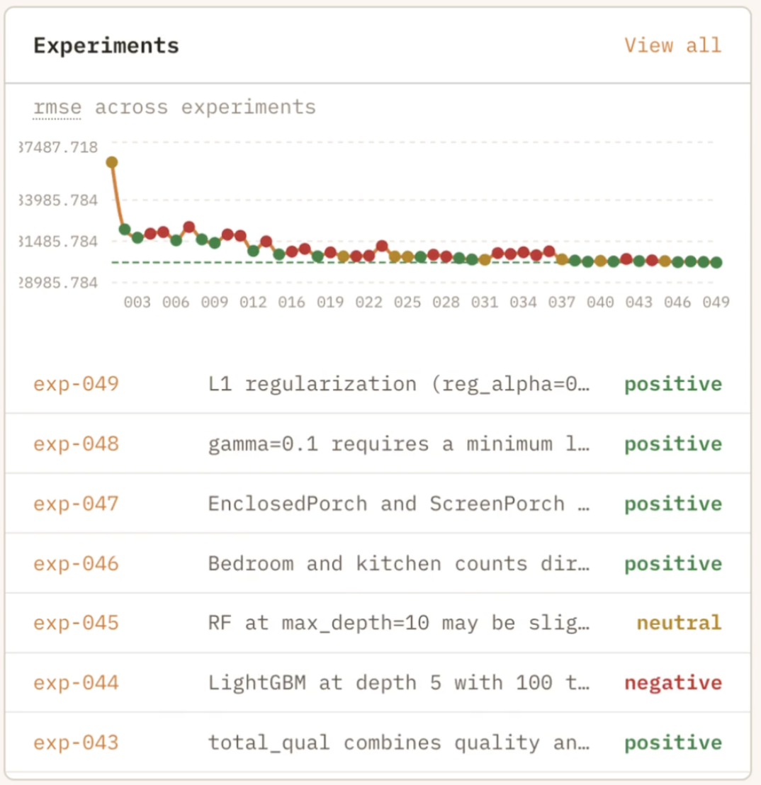 Every experiment with its hypothesis, verdict, and metric deltas. The trend chart tracks your primary metric across iterations — you can literally watch your agent get smarter.