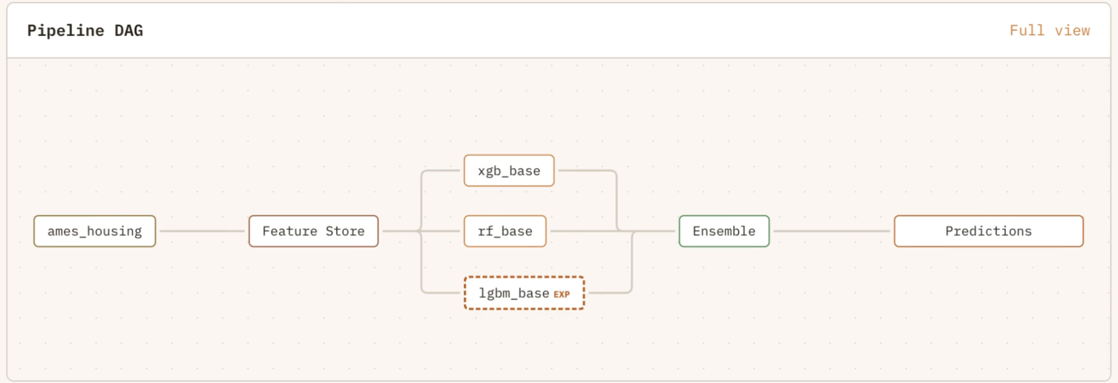 Interactive pipeline topology. Click any node for full config details. Models added by experiments show with dashed borders and EXP badges.